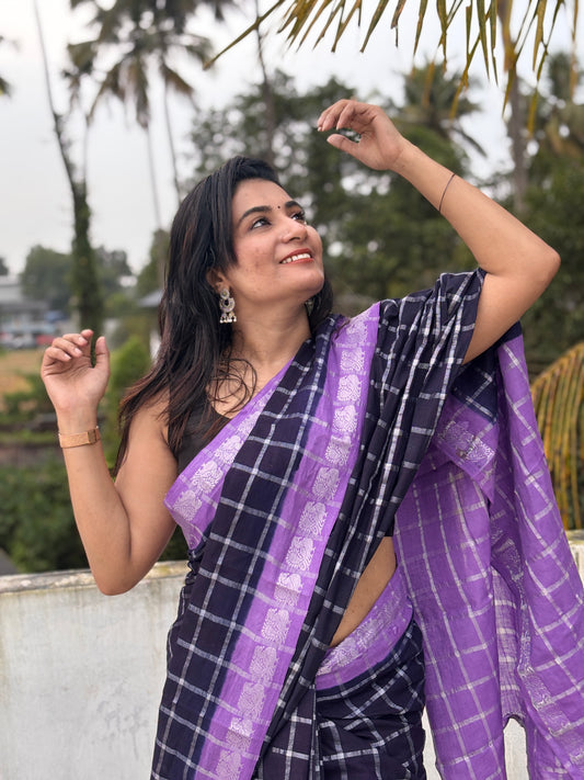 Silver Pavithra kattam Sungudi cotton saree with blouse black & violet