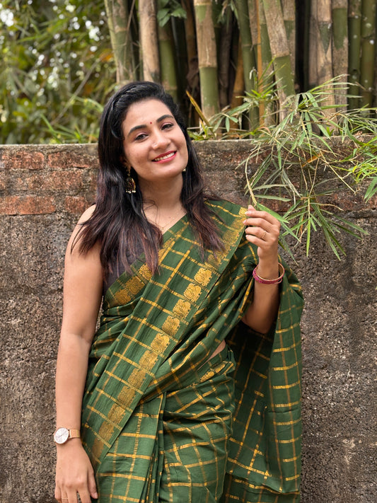 Sangita vintage korvai checks green saree with contrast border Shwetha Menon’s choice