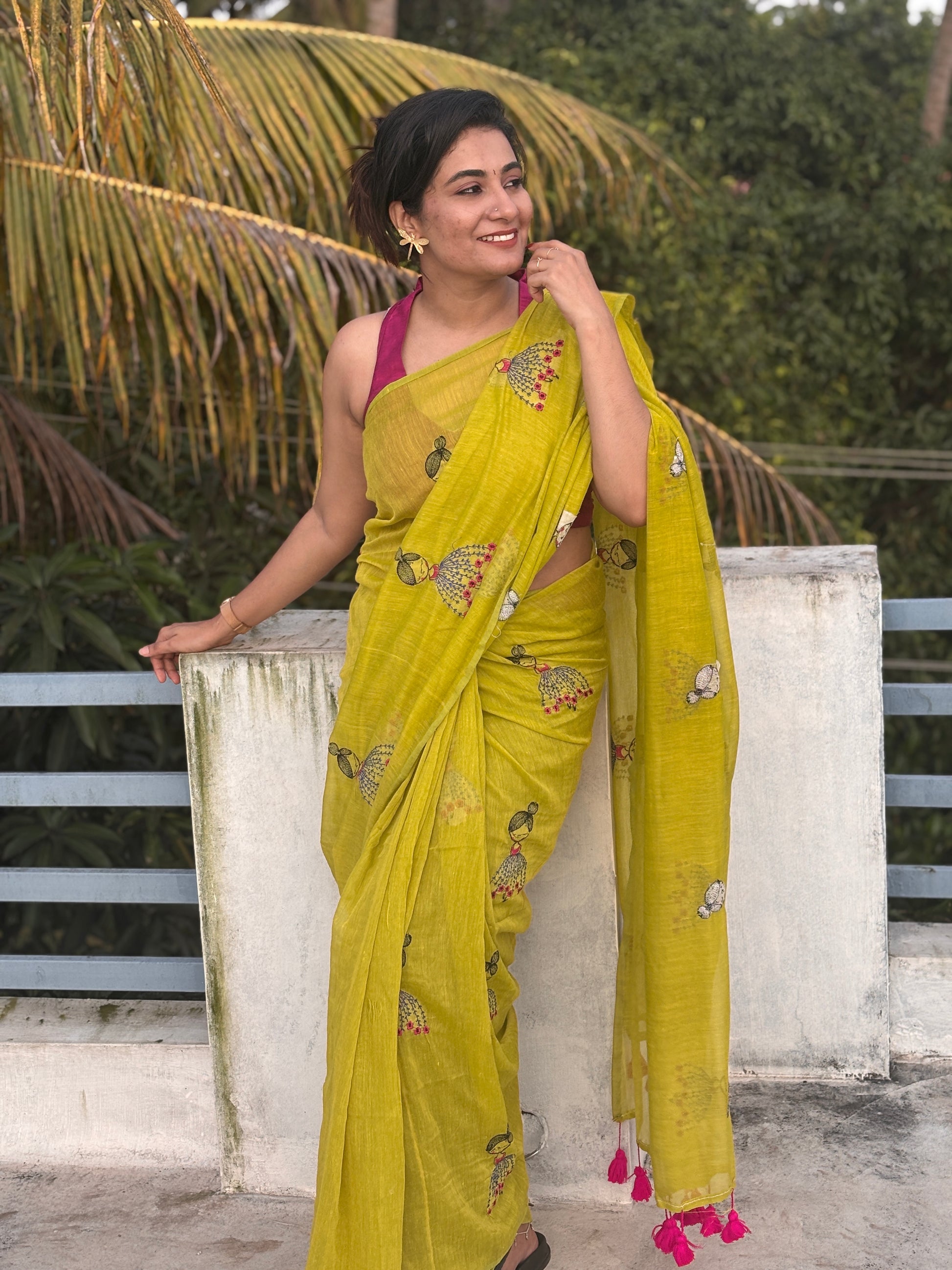 Soft cotton doll design embroidered Saree with big pink tassels.