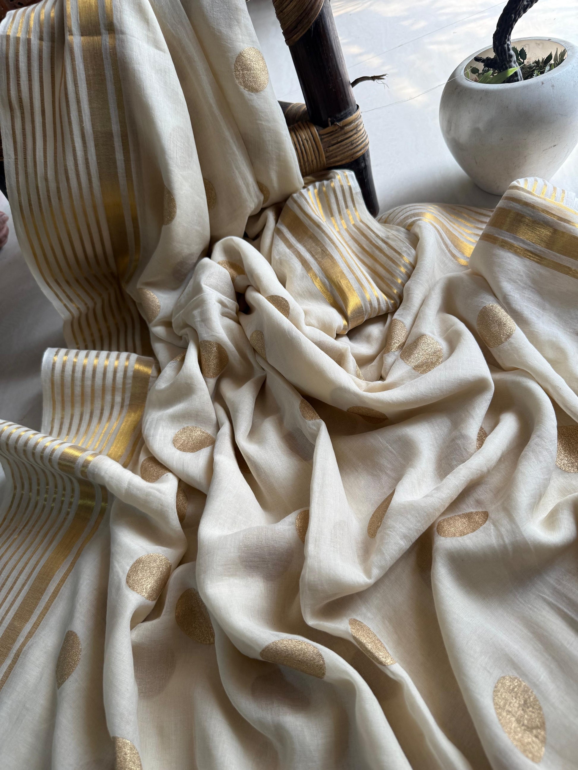 Golden polka handloom Mul Mul Saree Festive edit