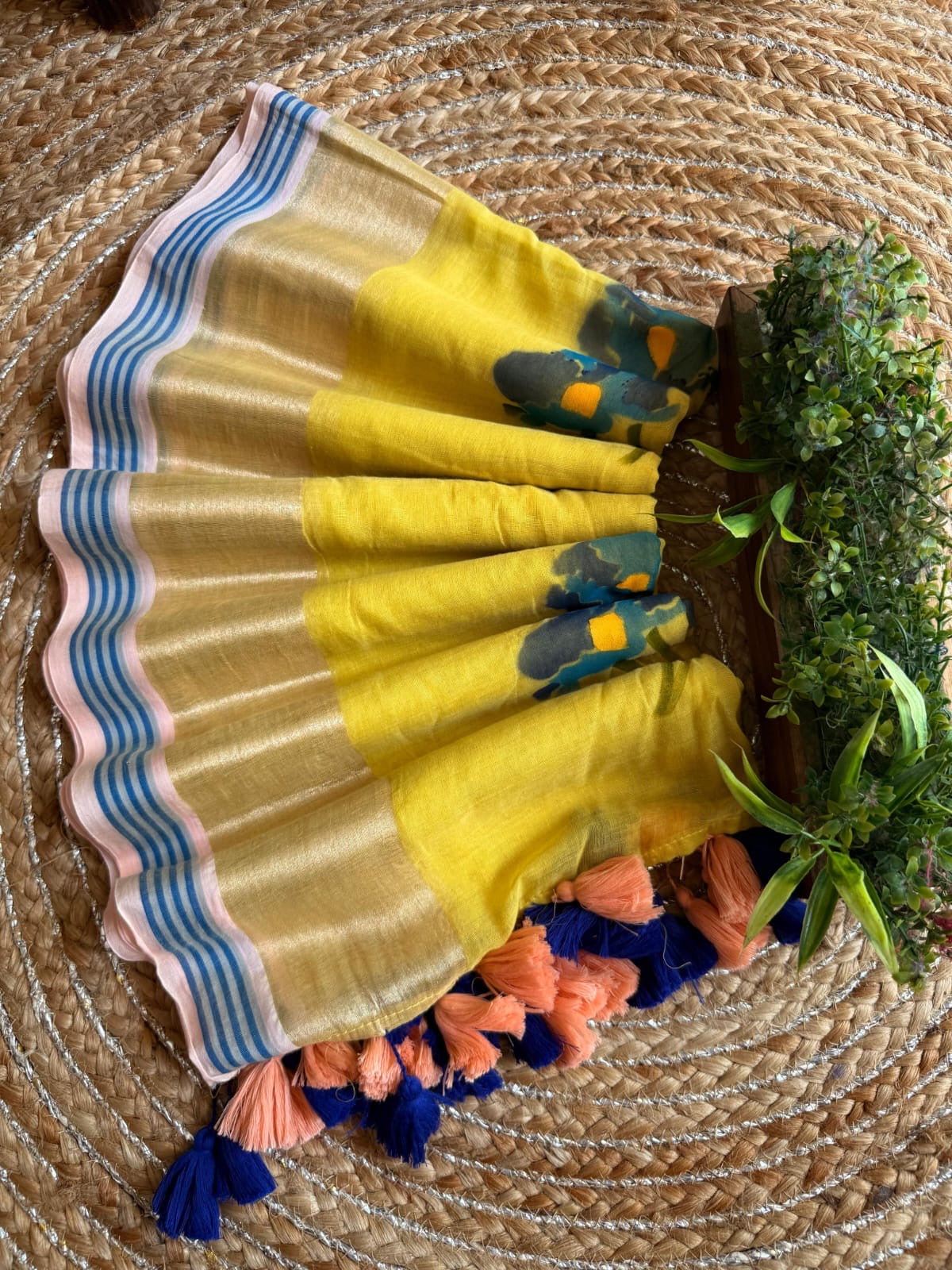 - Features: Hand-painted design with floral motifs and tassels at the pallu