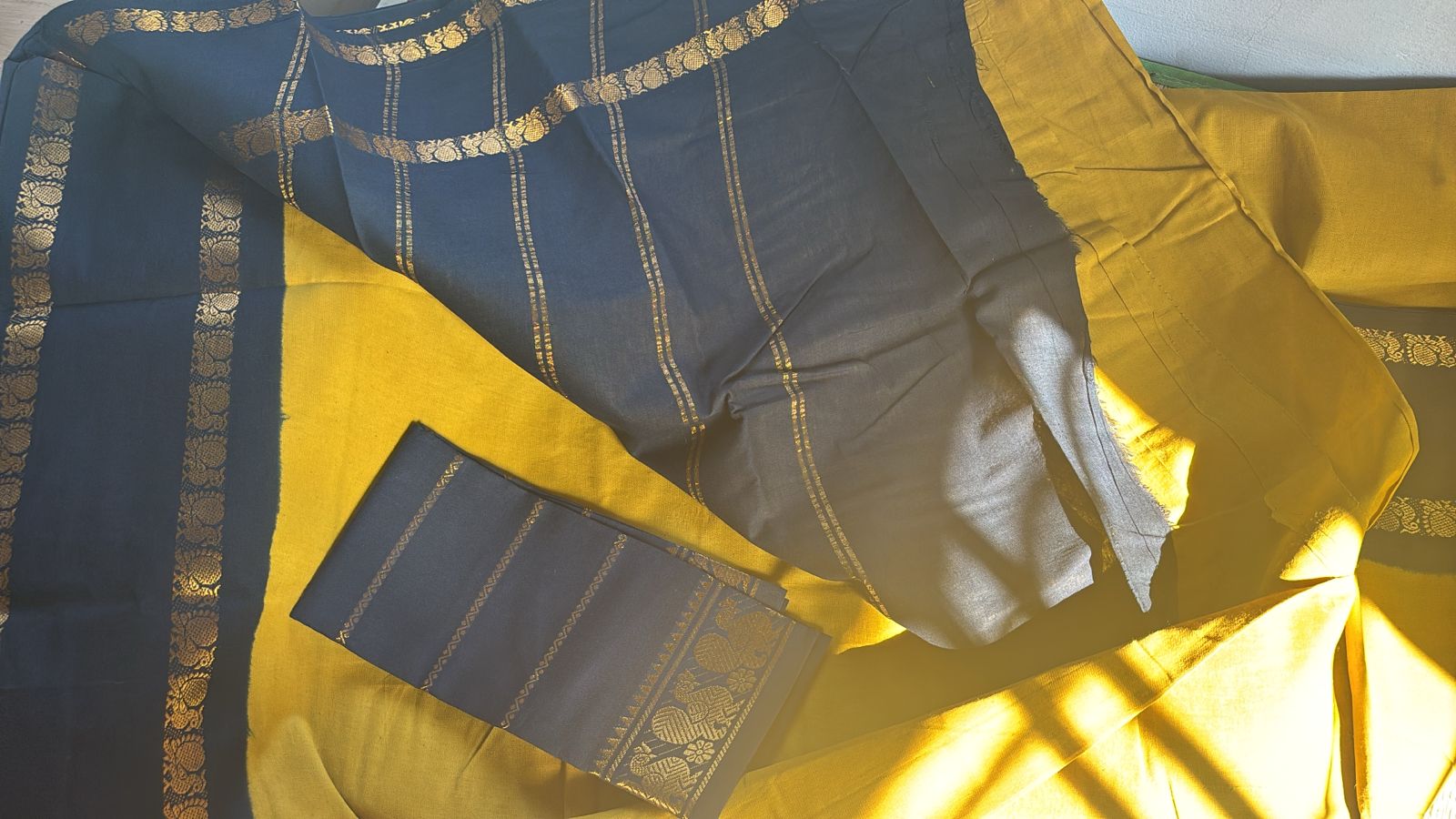 Tarangini Sungudi cotton retta petta saree with contrast Pallu and borders mustard and black