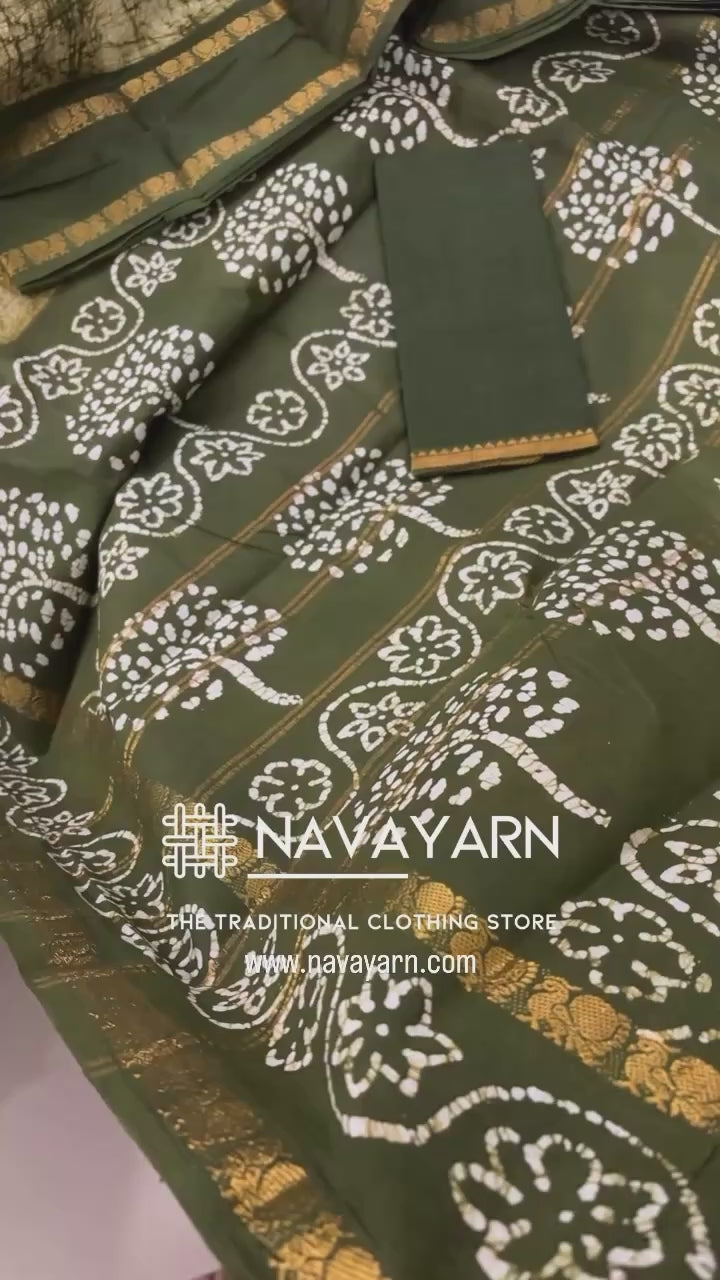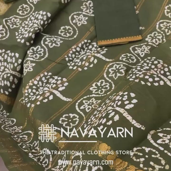 Tarangini wax batik tye dye Sungudi cotton saree with grand pallu and blouse (green gram colour )